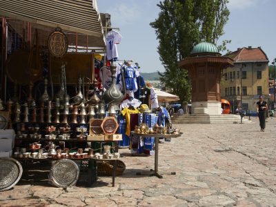 Now: Copper lane on Kujundžiluk for trays and sets Next: Latin Bridge for a river angle and short context stop Nearby: Vijećnica City Hall for a façade and the short walk back