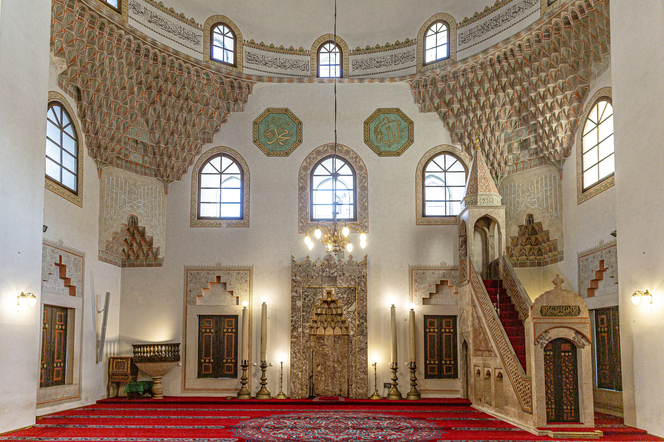 Now: Mosque courtyard and prayer hall for calm rhythm and light Next: Latin Bridge for a short river context stop Nearby: Baščaršija coffee lane for a džezva and small cakes