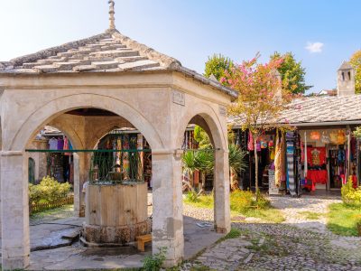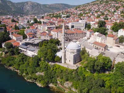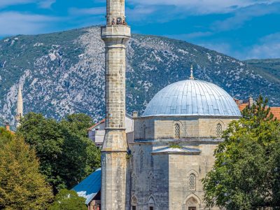 Koski Mehmed Paša Mosque offers Mostar’s classic overhead view. A slim minaret rises above the bazaar roofs, with a tight spiral of stone steps to a small balcony that frames Stari Most and the river below. In the courtyard, lime trees shade the fountain and a simple door leads to the cool prayer hall. It is a short, focused visit that pairs perfectly with a bridge walk and a lane through copper stalls.