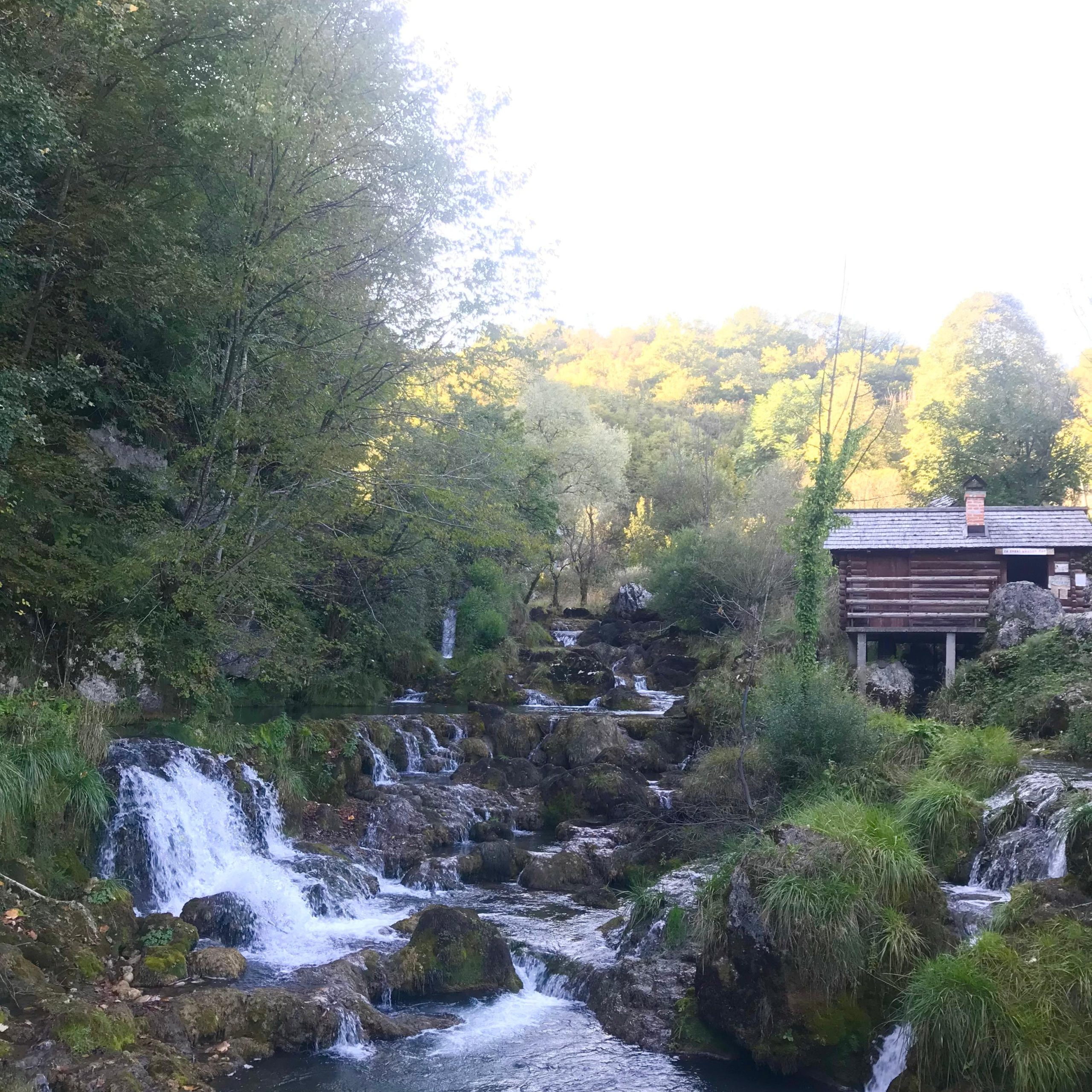 About 25 kilometres south of Banja Luka on the Vrbas, signed from the main road; mills and bridges sit beside the small waterfall