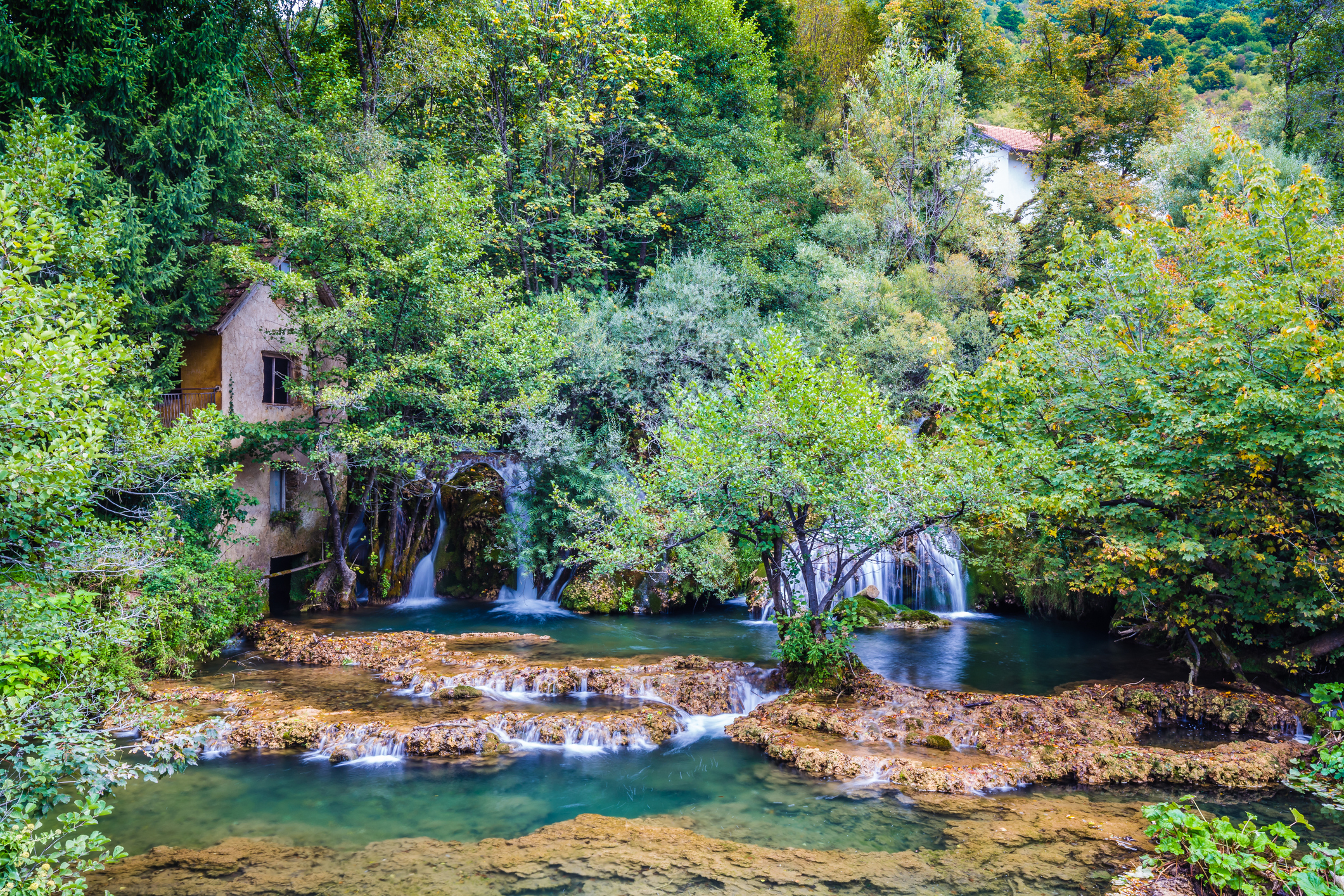 The Martin Brod cascades thread clear channels through a shaded village corner, with wooden footbridges linking small islands and low shelves. It is the quiet partner to Štrbački Buk: closer to the water, softer in sound, and easy to loop in a calm hour. Signed paths take you over bridges to safe viewpoints where you can watch currents split and rejoin, and where light sits green under trees.