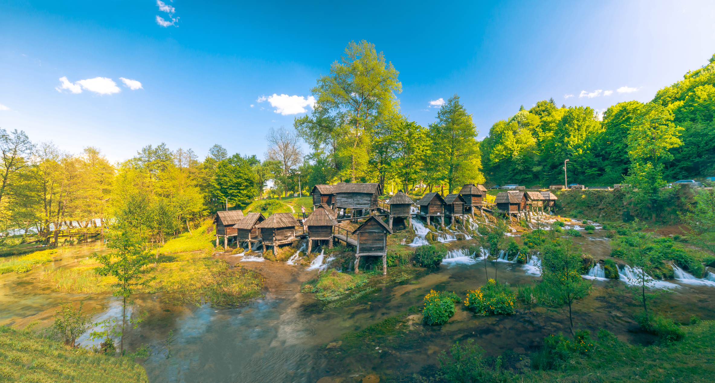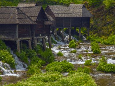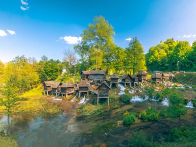 On the Pliva lakes a few minutes west of Jajce by road, at the cluster of wooden watermills above the lower lake