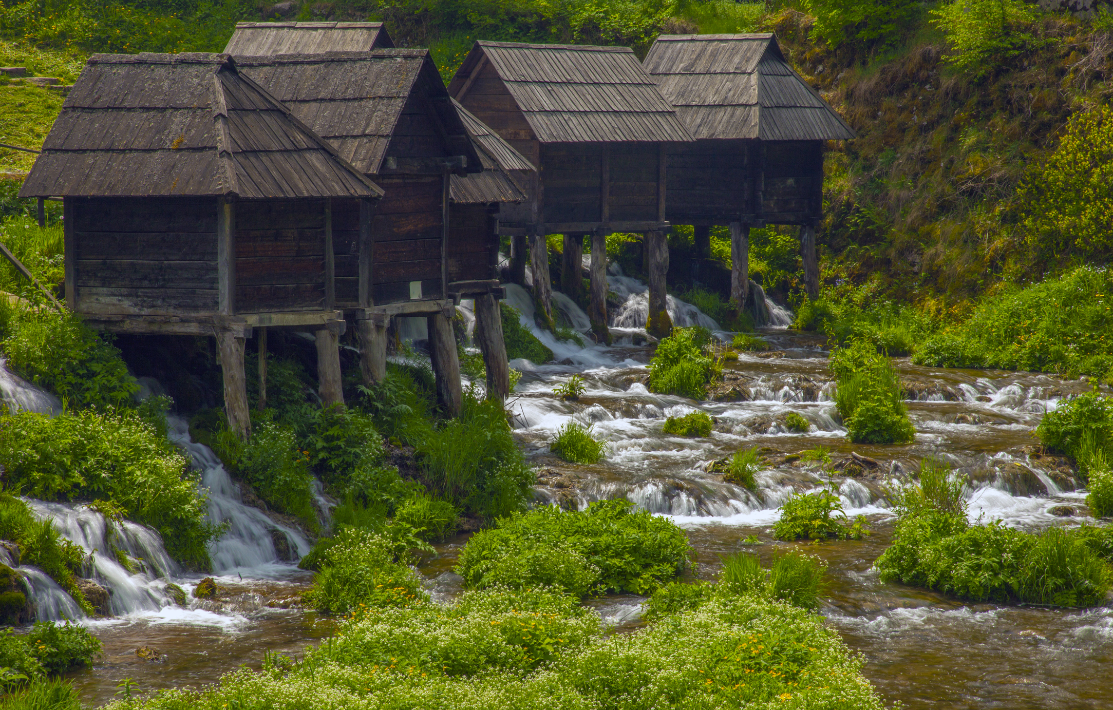 Wooden huts sit on low shelves above clear green. Watch small wheels and sluices, then step back for the wider angle that puts huts and bridges together.
