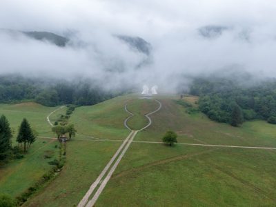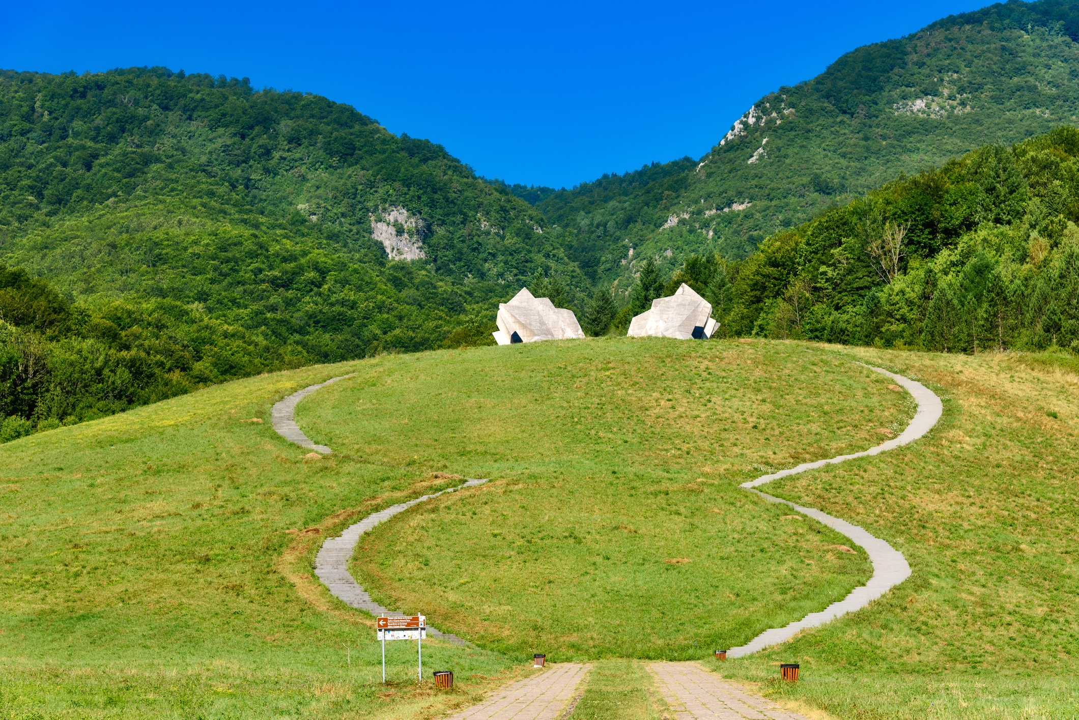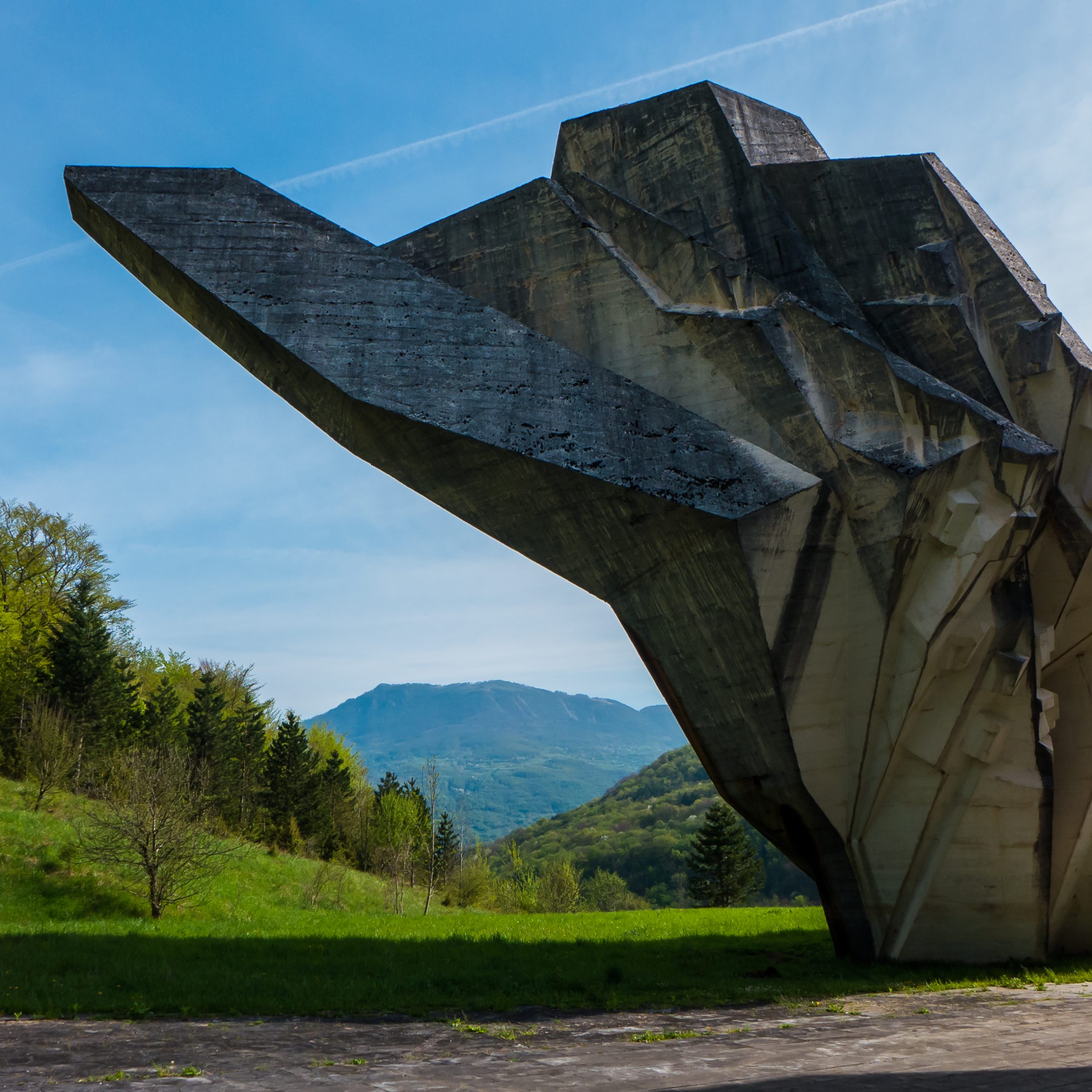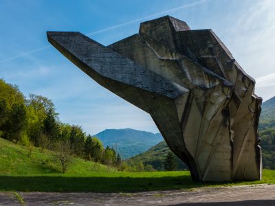 The Tjentište memorial stands in a wide meadow in Sutjeska, two concrete wings opening towards hills that hold much of the story. Paths cross the grass along an axis that leads the eye from stone to ridge, and a small museum presents maps, photographs, and objects from the 1943 battle in this valley. It is a place to walk slowly, look up to the slopes beyond, and connect the built form to the landscape that shaped events.