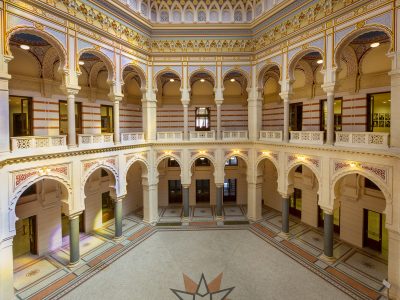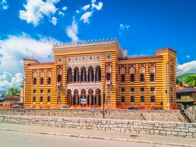 Vijećnica is Sarajevo’s landmark City Hall, a striped façade of Moorish Revival lines beside the Miljacka, rebuilt after wartime destruction and reopened to the public. Inside, a tall atrium rises under a glass roof with arcades on three levels; exhibition rooms sit off the galleries with panels that trace the building’s history and the city’s civic life. It is an easy, focused visit that pairs perfectly with the Latin Bridge and Baščaršija in one short loop.