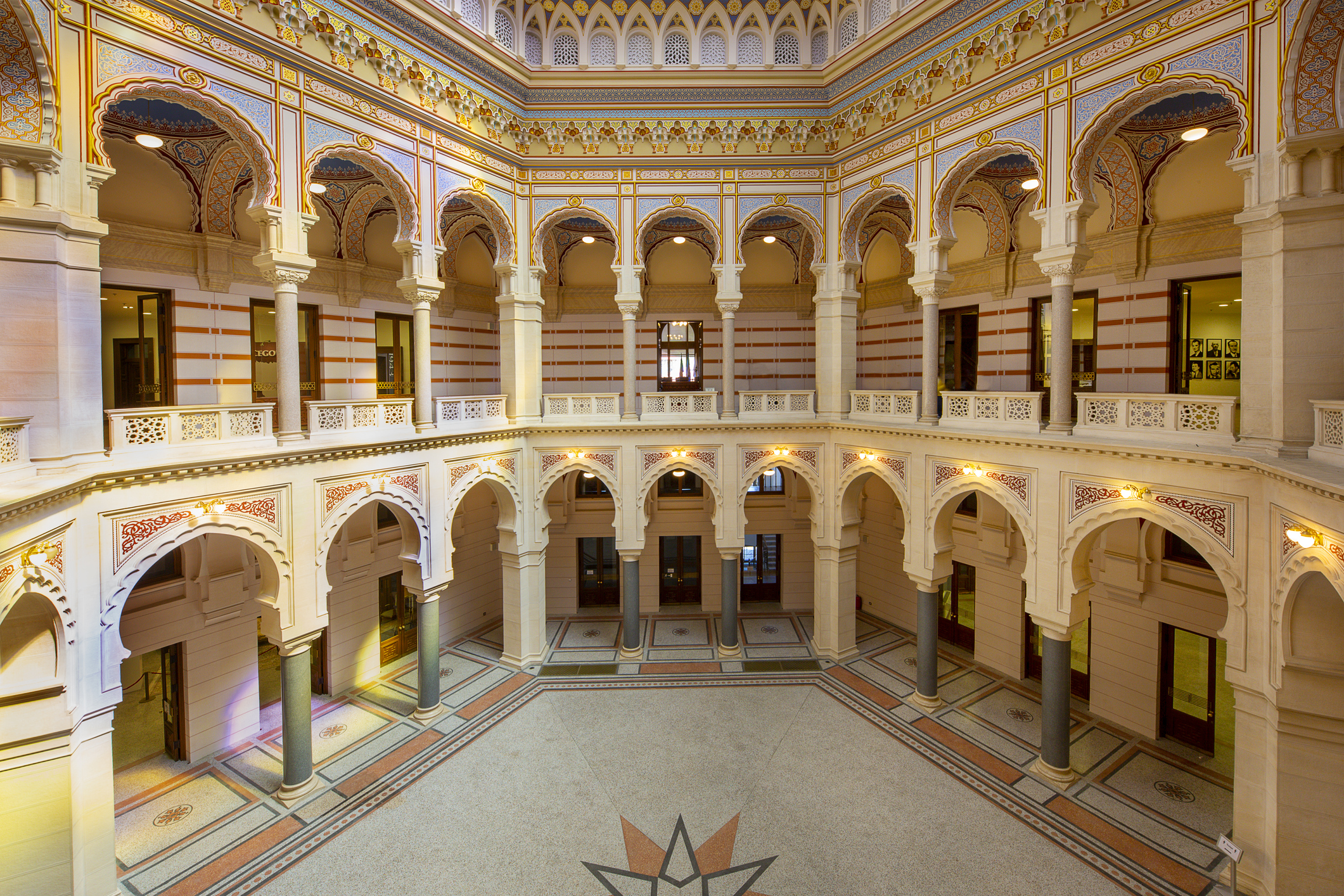Small exhibitions explain the building’s story and the city’s civic life. Read briefly; the space itself is the headline.