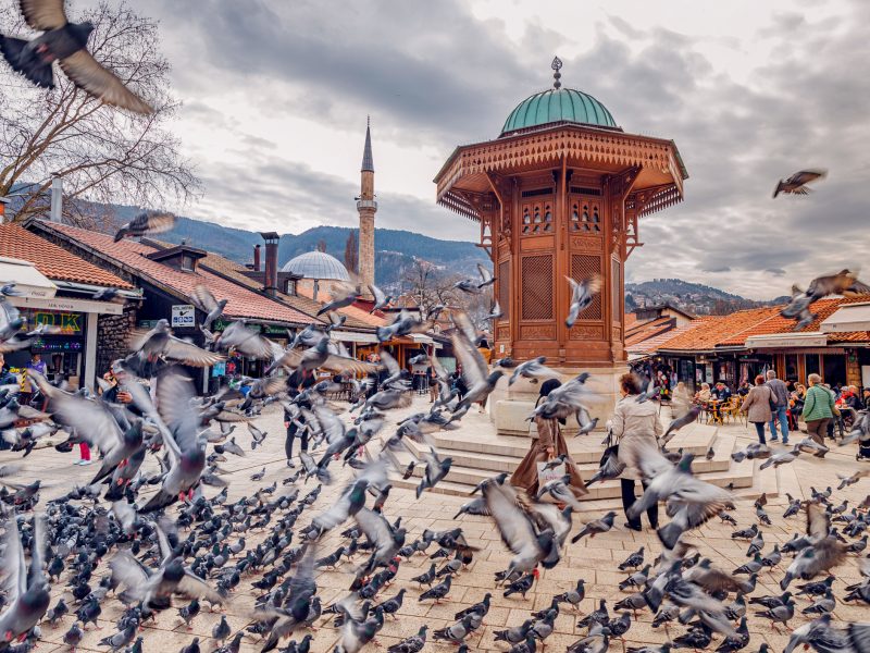 Walk Baščaršija Old Bazaar for copper lanes and kahva (Bosnian coffee) sets, step into the Gazi Husrev-beg complex courtyard, and cross to Vijećnica for a bright atrium and quick exhibition rooms. Loop to the Latin Bridge corner for a short, factual stop.