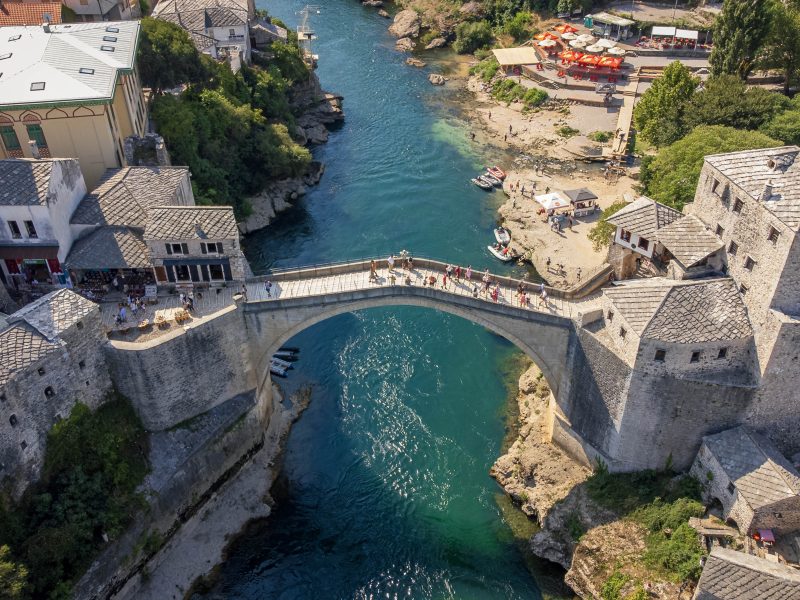 Start on ground-level Stari Most terraces and the west-bank path for wide river frames. If you like narrow stairs, the Koski Mehmed Paša Mosque minaret offers an overhead frame; keep it optional.